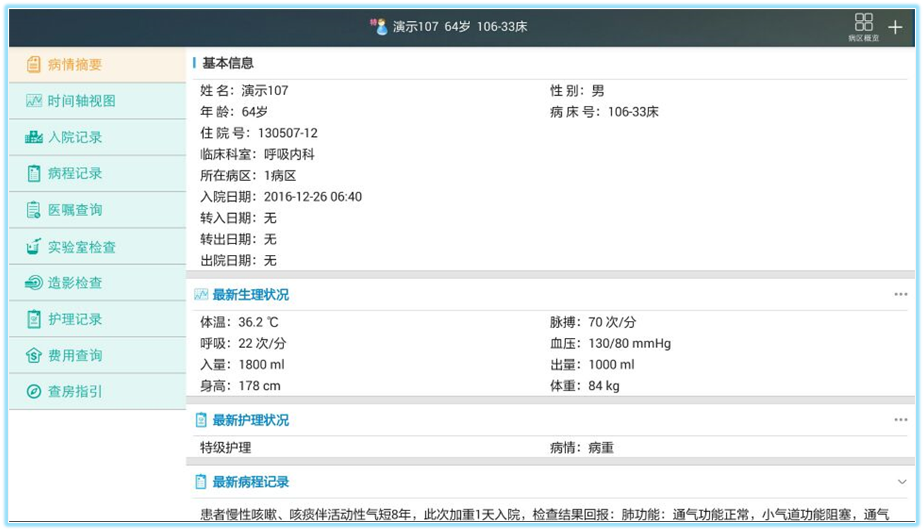 病情摘要——患者基本信息、最新生理狀況、護(hù)理狀況、病程記錄