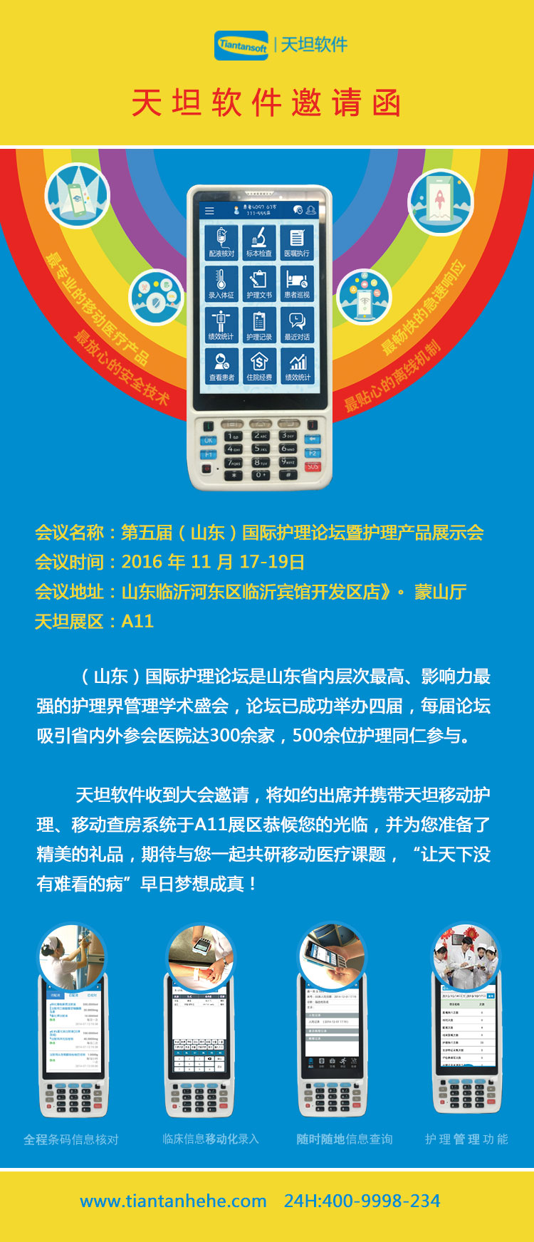 黃金十月,天坦軟件收到 “第五屆(山東)國際護理論壇暨護理產(chǎn)品展示會”的邀請,會議將于2016 11 17-19日,在臨沂賓館開發(fā)區(qū)店舉行。天坦軟件將攜天坦移動護理、天坦移動醫(yī)生等系列產(chǎn)品,于A11展臺前恭候您蒞臨指導(dǎo)工作。