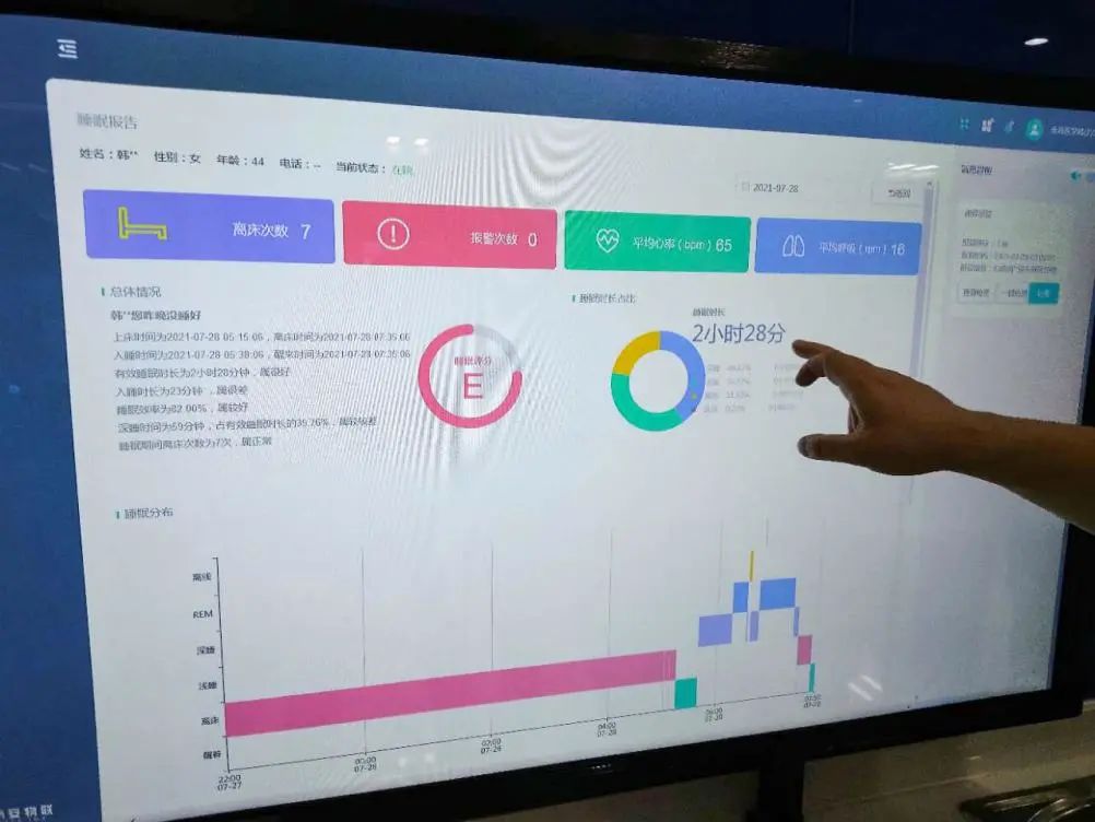 除了輸液外,患者的生命體征和運(yùn)動(dòng)軌跡也是醫(yī)護(hù)人員需要時(shí)刻操心的問題。智慧病房搭建智能在床實(shí)時(shí)監(jiān)測(cè)系統(tǒng),在床墊下放置了傳感器,可以精準(zhǔn)測(cè)量和傳輸患者的生命體征、睡眠、離床等數(shù)據(jù),一旦數(shù)據(jù)異?;蛘呋颊唛L(zhǎng)時(shí)間不在監(jiān)測(cè)范圍內(nèi),系統(tǒng)會(huì)自動(dòng)進(jìn)行異?;螂x床、跌落等警報(bào),可以及時(shí)避免意外事件發(fā)生。