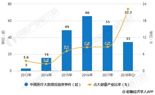 2013-2018年Q1中國醫(yī)療大數(shù)據(jù)投融資事件及占大健康產(chǎn)業(yè)比率統(tǒng)計(jì)情況